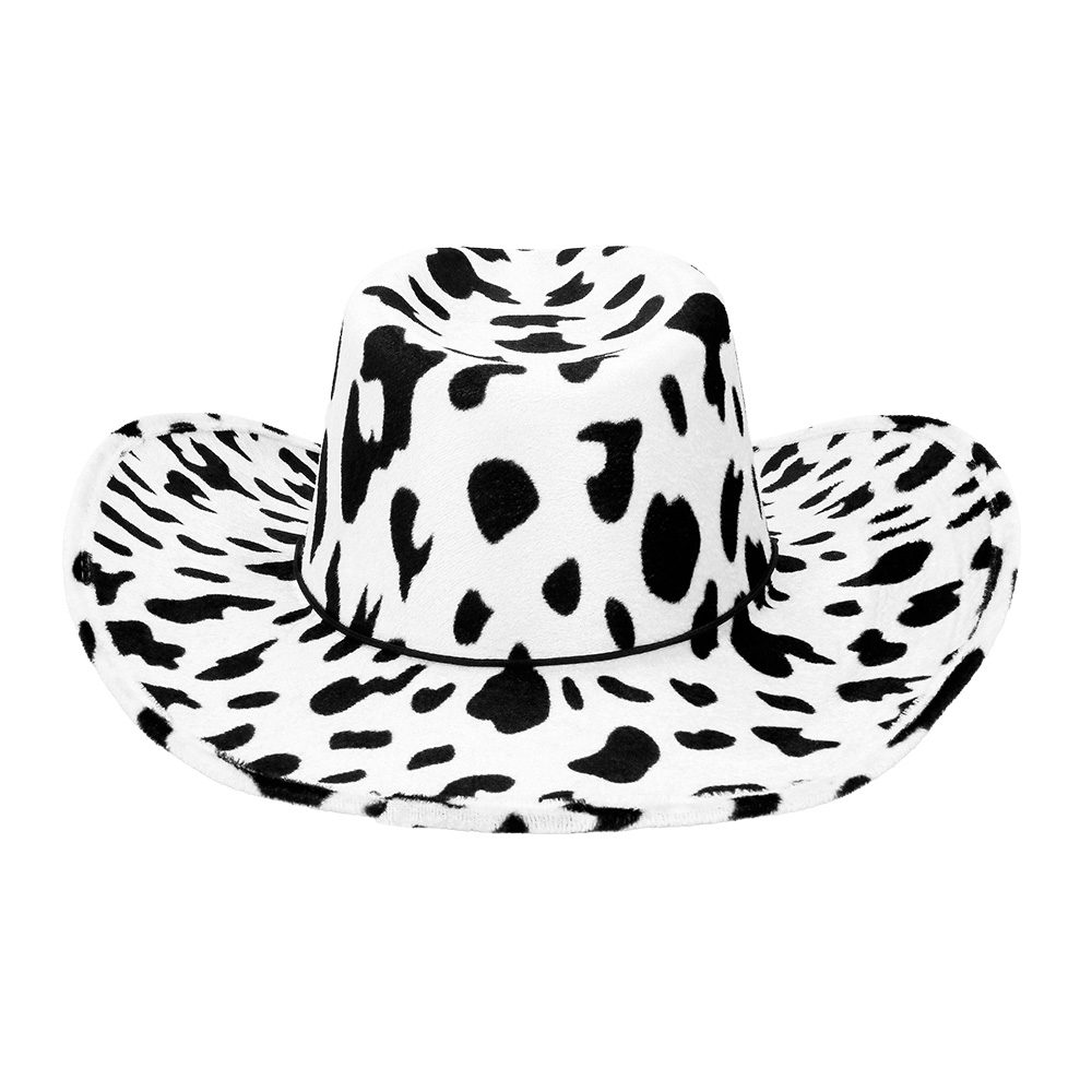 Cowboyhoed koe print combineert humor met een klassieke westernstijl. De zwart-witte koeienprint zorgt voor een speelse en opvallende uitstraling op elk feest.