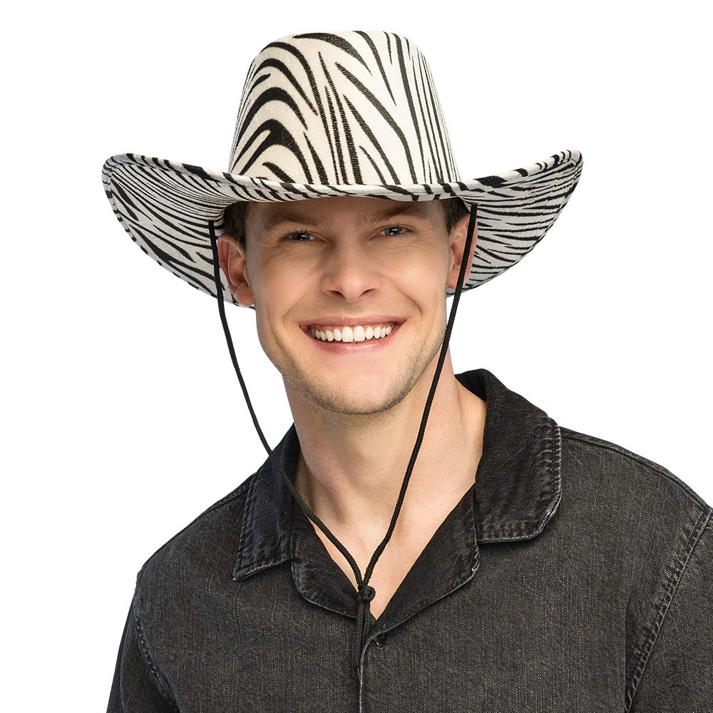 Cowboyhoed zebra print geeft jouw outfit direct een speelse en opvallende uitstraling. De zwart-witte contrastrijke print zorgt voor een echte eyecatcher op elk feest.