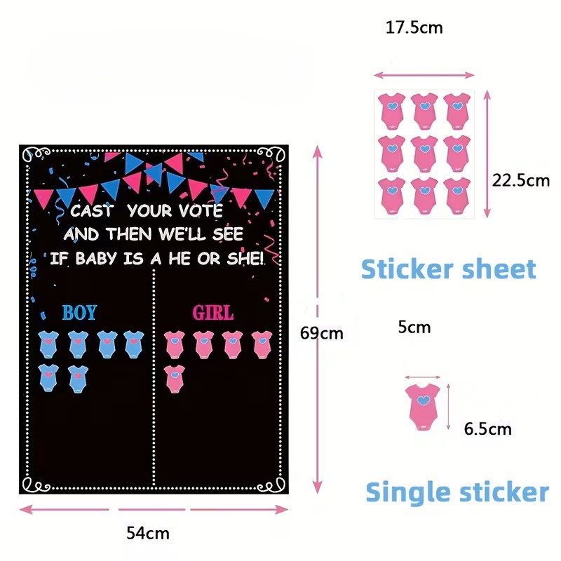 Niemand wil alleen maar toekijken; met deze set betrek je vrienden en familie echt bij de onthulling. Gasten kiezen een sticker in de kleur van hun vermoeden en plakken deze in de juiste kolom. Wie heeft het bij het juiste eind?