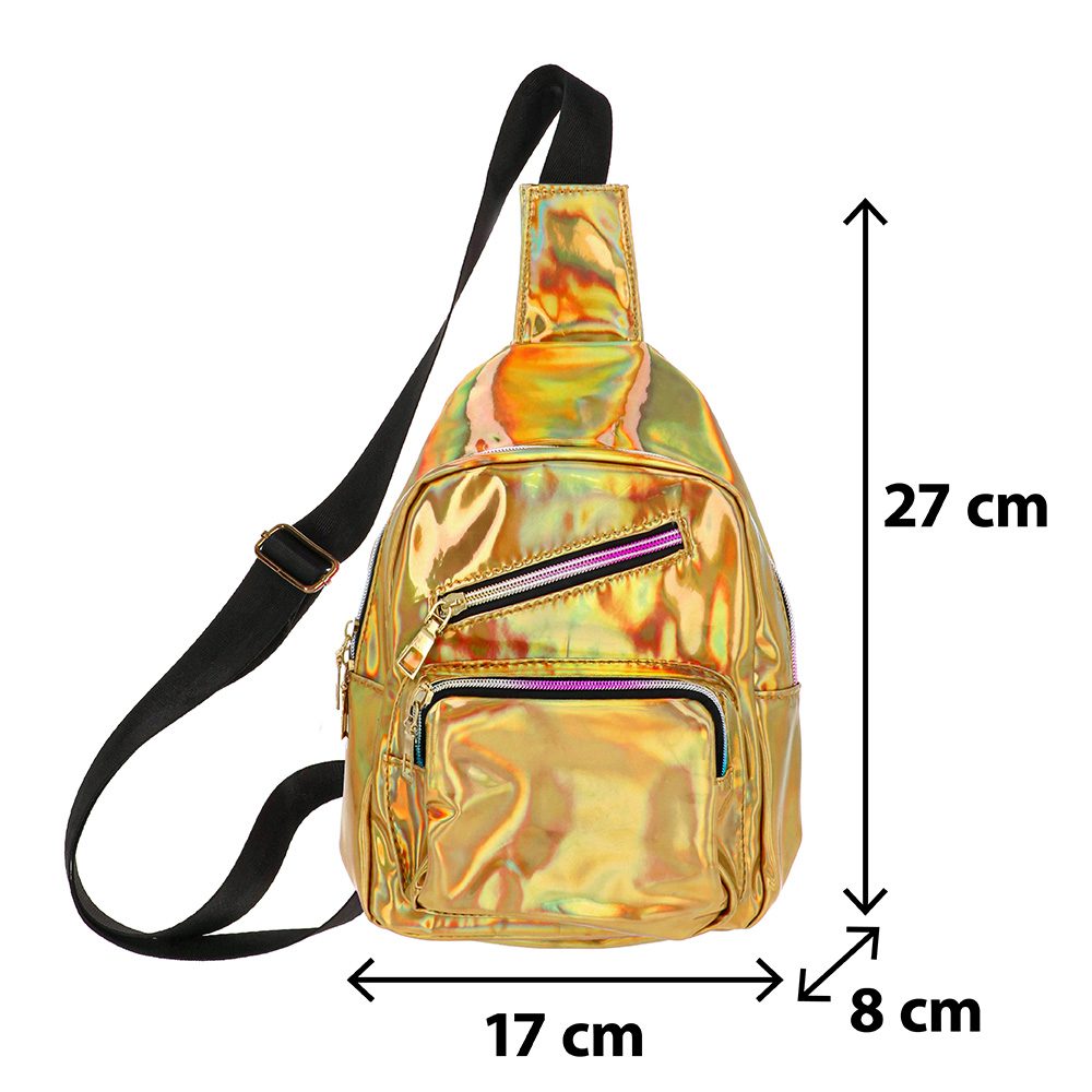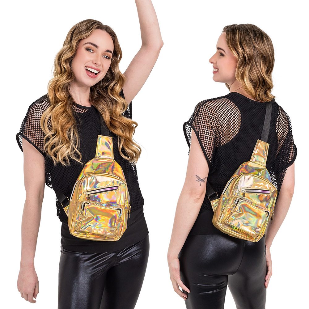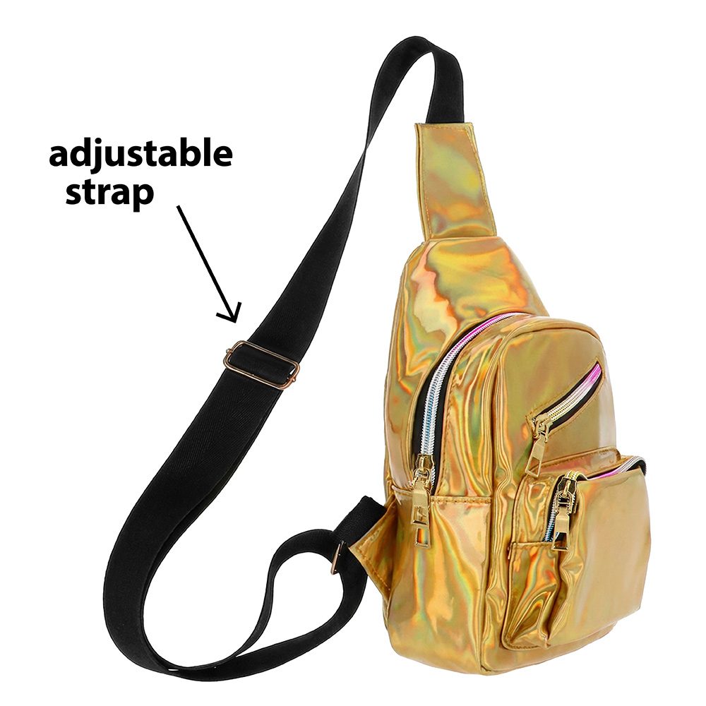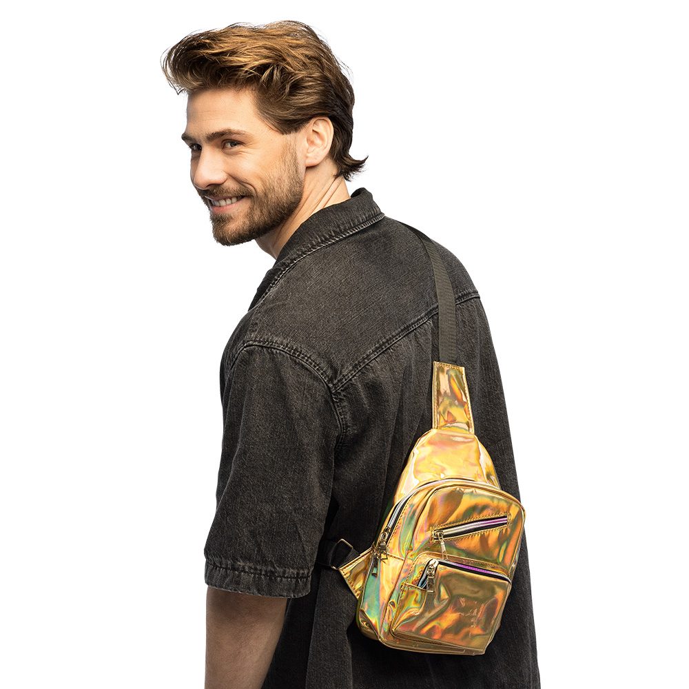 Holografische crossbody tas goud is een luxe en praktische keuze voor festivals, raves en feestjes. Dankzij het opvallende holografische materiaal verandert de tas van kleur bij elke beweging en lichtinval.